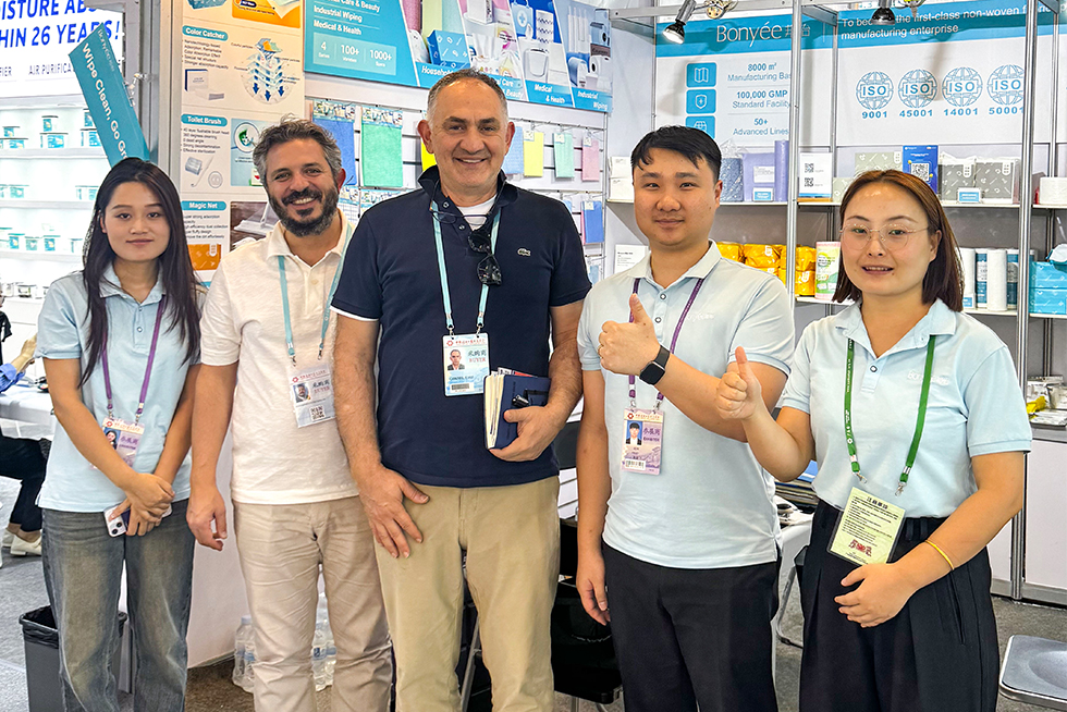 展会期间,我司展位接待了诸多来自中东、沙特等国采购商,他们在了解抹布的同时,更感兴趣个护类洗脸巾、浴巾等产品,与我司销售进行深入沟通交流,这一信息也反映出中东市场对个护产品新需求的提升。